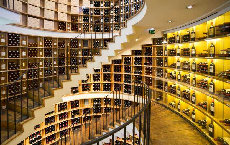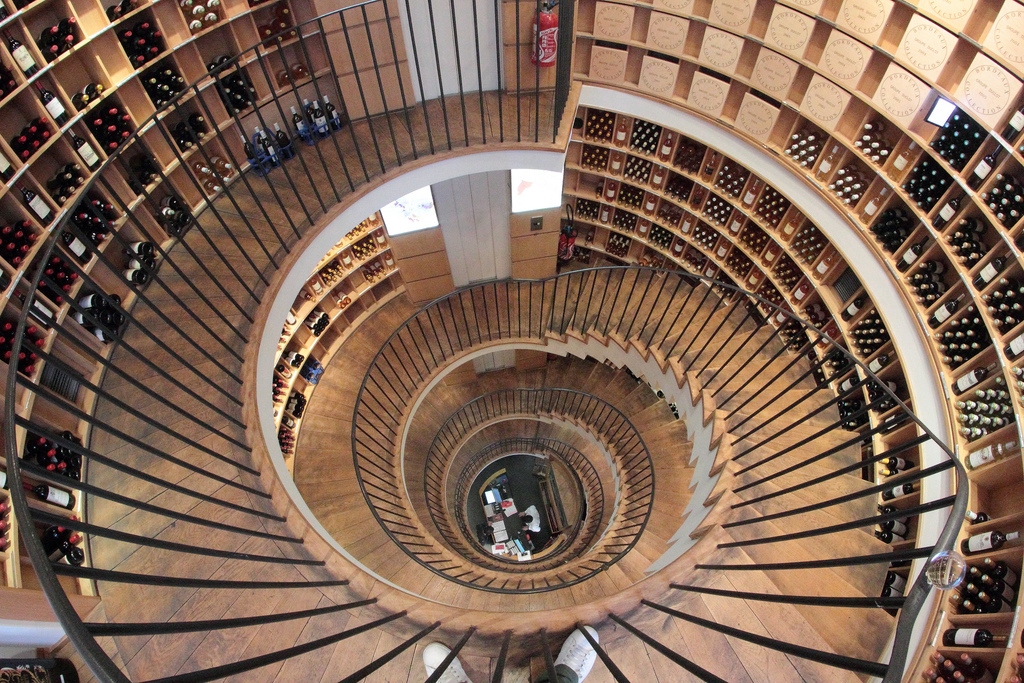 와인 계산대를 중심으로 나선형 계단이 약 3층 높이의 건물끝까지 올라가는데요, 계단의 경사로를 따라 와인이 전시된 형태인거죠..